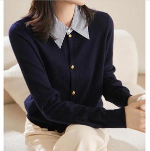 @ 知識人のストライプは偽の2つの学院風のウールのニットのカーディガンの女性の秋冬のMLZYB25576をつなぎ合わせます。