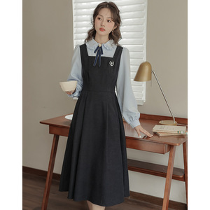 新しい年齢を減らす偽ツーピースバッジアメリカンカレッジスタイル人形襟ドレス小さな気質蝶ネクタイスカート