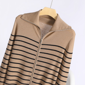 超細い柔らかいモチモチのウールのダブルファスナーの襟のストライプのニットのカーディガンの上着の気質の百合の修身のコートのセーター