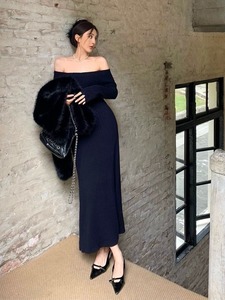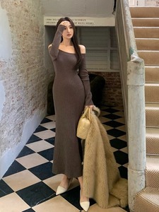 肩のレトロなカレー色の長袖ニットワンピース女性は冬に腰を締めてヒップスカートを包んで中の長いスカートを作ります。