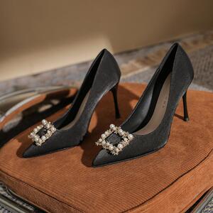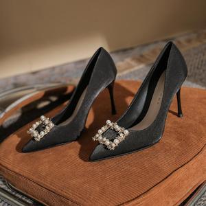 少女尖头高跟鞋女2025春季新款百搭方扣水钻珍珠婚鞋浅口细跟单鞋
