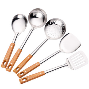 調理器具、火傷防止、模造木目調ステンレス鋼、厚みのあるスパチュラ、大きなザル、フライパンスパチュラ、日常使用キッチン用品セット