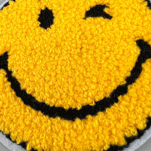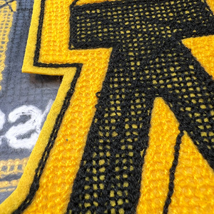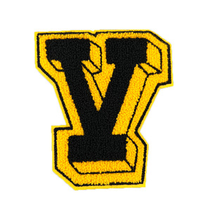 黄金色の笑顔の英語のアルファベットのタオルの刺繍は野球の服を貼ってコンピュータの刺繍の標識のアルファベットを飾ってアイロンをかけます。
