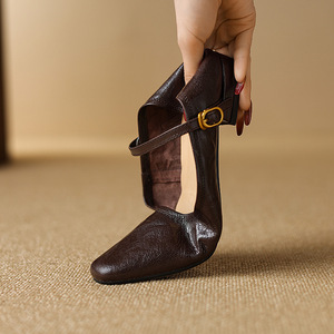 大好着 ~ 頭層羊皮平底小革靴女性復古小角頭浅口靴一字メアリージェーン靴付き