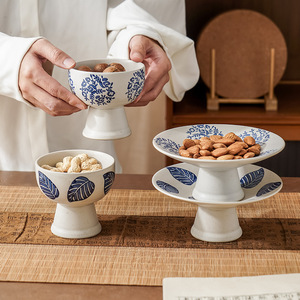 青花手彩陶磁器のドライフルーツ皿の背の高い洗練された日本式ティープレートのシンプルな高足ケーキ皿の家庭用ドライフルーツ皿