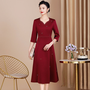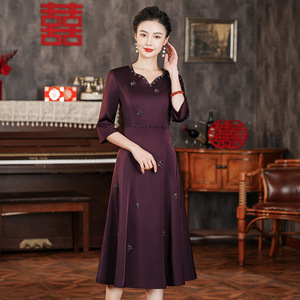結婚式のお母さんの春のドレスの高級な喜姑の披露宴は中年の結婚の妻のドレスのvネックのワンピースを詰めます。