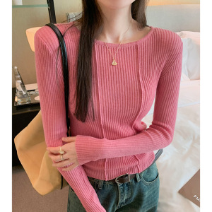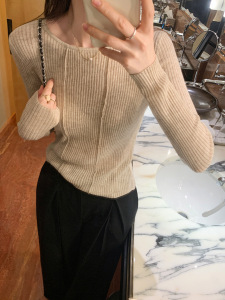 無地ラウンドネックニットセーター レディース 春 2025 新作 ウールトップス インナー スリムフィット ノースリーブ 長袖Tシャツ