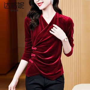 クロスvネックtシャツ女性長袖春装洋気新レトロ盤ボタン底付きシャツ黒ベルベット上着女性