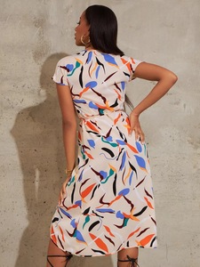 欧米の国境を越えた外国貿易の婦人服の独立駅のアマゾンの新型のファッションのプリントは袖のvネックのベルトのワンピースの女性を結びます。