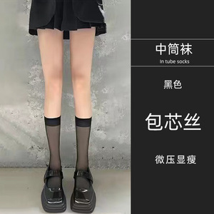夏用JKカーフソックス、極薄ミッドカーフストッキング、日本製ミッドレングスブラックシルクベルベットコアスパンミッドカーフハイソックス