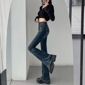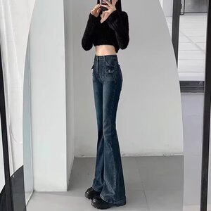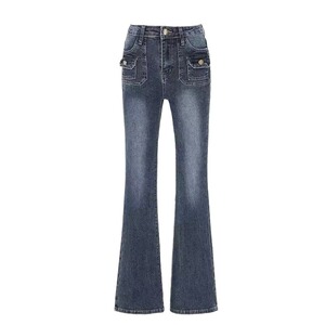 レトロな弾力性の高い腰のマイクロラッパのジーパンの女性の2024春秋のデザイン感の多いポケットのスリムなラッパのズボン