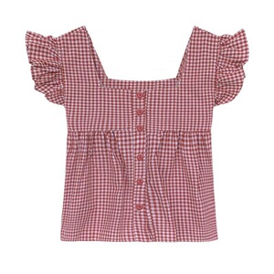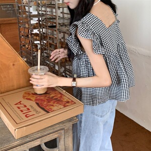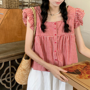 ショートシャツチェック柄フレンチパフスリーブへそ出しフライングスリーブシャツレディース新作夏シフォン2025半袖