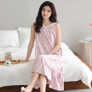 綿100% キャミソールナイトガウン レディース 2025年夏新作 ノースリーブ 純綿 ミドル丈 膝丈 ピンク ワンピース型ナイトガウン