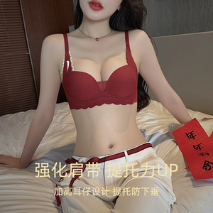 赤い下着の女性の本命年の竜のスーツの小さい胸は集まって厚いです。