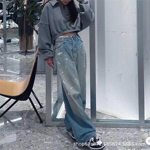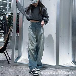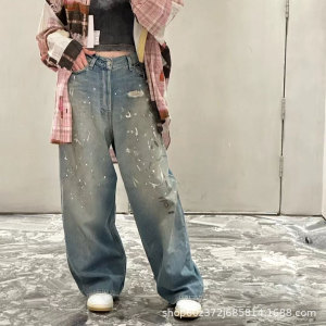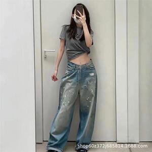 Wang Churan~デザインされた汚れ染め、スプラッシュインク、ウォッシュ加工のハイウエストレトロダメージ加工ストレートワイドレッグジーンズ、スプラッシュインクとダメージ加工