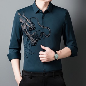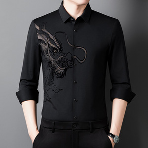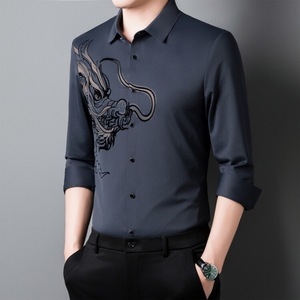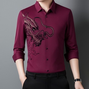 赤い中国の竜の長袖のシャツの2024春秋の男性の金の氷の糸の無痕の寸のシャツの中年のお父さんはハイエンドのシャツを詰めます。