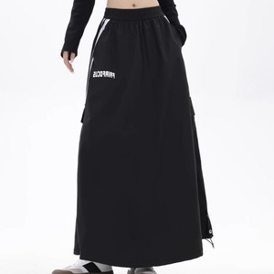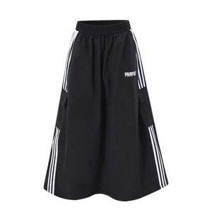 秋の半身のスカートの女性のアメリカ式の高い街のドーパミンはサイドのストライプを着てフォークを開けてゆったりしています。