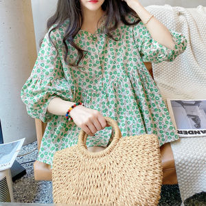 子供のシャツの上着の夏の韓国版のゆったりした丸首の甘い灯籠の袖の蓬蓬の花の綿の麻のシャツの女性の7分の袖