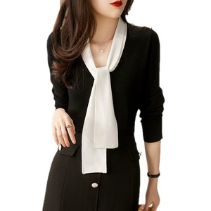 ニットの女性2024早秋ファッションの洋気vネックのセーターは色のリボンの気質にぶつかって、着痩せしている長袖の上着を見せます。