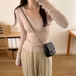 スリムギャルの薄いタイプの長袖のニットの女性の早秋の新型のデザイン感のvネックのtシャツを重ねて上着を着ます。