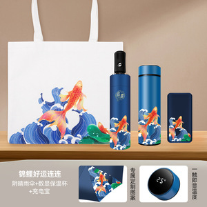ブルー【傘 + 保温カップ + 充電宝-キャンバスバッグ】3点セット