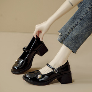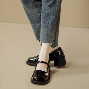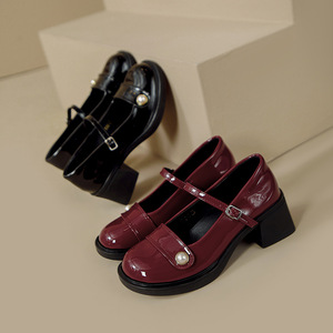 漆皮真珠メアリー珍jk靴2024字太と靴の女性春秋厚い底のワインの赤い靴