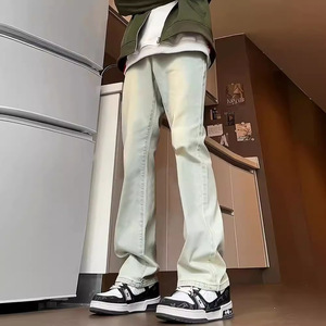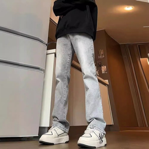 スモッグの煙の灰色のジーパンの男性のタイプの春と秋のアメリカの復古のvibeズボンは身を修める弾力の小さいラッパのストレートなズボンです。