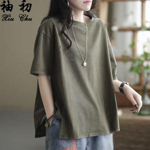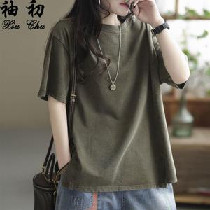 Tシャツの女性の夏服の新型半袖のゆったりとしたレトロな純色の百合はやせている服のtシャツの上着を見せます。