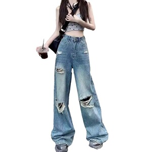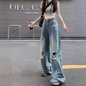 アメリカの高い街の青い穴のジーパンの女子学生の夏の新型のinsの潮のブランドのまっすぐな筒はゆったりとしています。