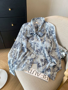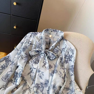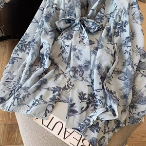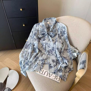2024年新中国風レトロリボン付き蝶結びプリントシャツ女性高級感洋風独特シャツブーム