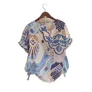 大きいサイズの婦人服の国風の復古のゆったりしているプリントの綿麻の半袖のtシャツの女性の2024夏の新型の亜麻の上着