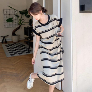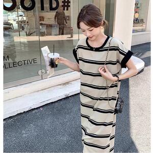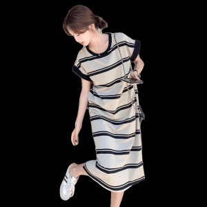 カジュアルなレトロなストライプのtシャツのワンピースの夏の大きいサイズの婦人服の独特な気質はゆったりしていて痩せています。