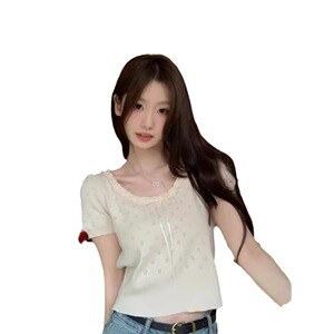 2025年夏新作 レース透かし彫りリボン付きニット半袖Tシャツ レディース 可愛いスリムフィット 学生向けトップス トレンド