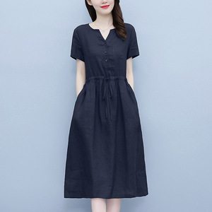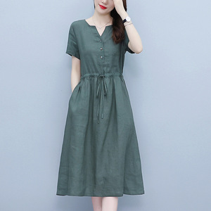 コットンドレスレディースサマードレス新しい半袖スカートハイエンドソリッドカラーレースアップウエストレディースミドル丈スカート