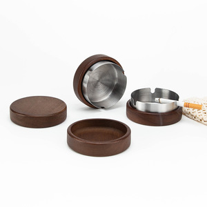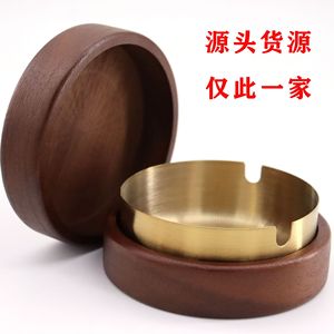 实木带盖烟灰缸防飞灰不锈钢家用仿古客厅卧室茶几灰缸胡桃色木艺