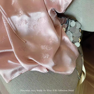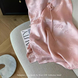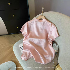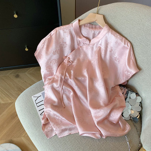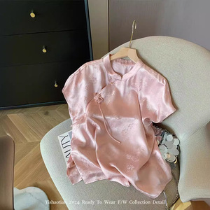 シュユの粉の新しい中国式のサテンのジャカードの半袖のシャツの女性の夏の2024国風の気質の酢酸はチャイナドレスの小さいシャツを改良します。