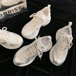 洋気百合は厚い底のお父さんの靴の2024春の牛革のネットの布のハイヒールの色を合わせてカジュアルな運動靴の女性を結びます。