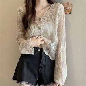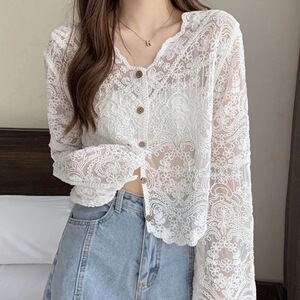 春夏新作韓国系デザイン感フック花透かし彫りレースシャツ高級感洋気vネック長袖日焼け止め上着女