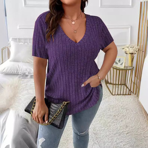 2025アマゾン春夏起爆クロスボーダー純色ビッグサイズ女装優雅上着vネックピット半袖プルオーバーtシャツ
