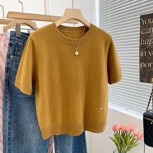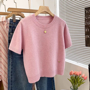 フレンチスタイルの高級感漂うミルク系右肩半袖ニットセーター2025夏薄手優しい雰囲気シンプルTシャツレディーストップス