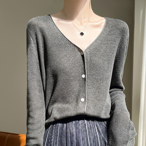 レディース梳毛ウールカーディガン Vネック 春夏秋新作 上品通勤 日焼け止め 通気性 薄手ニットジャケット
