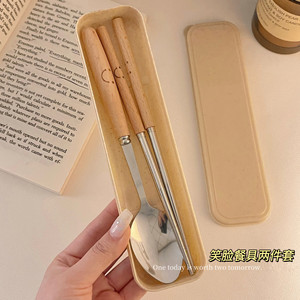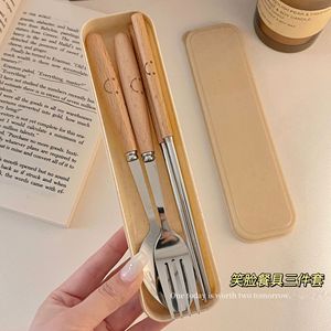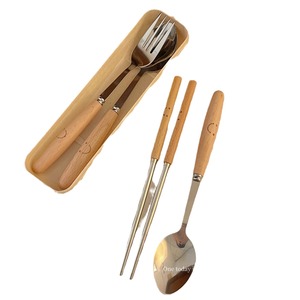 かわいい笑顔箸スプーンフォーク食器セット木柄ステンレス三点セット学生児童成人携帯
