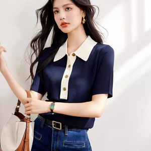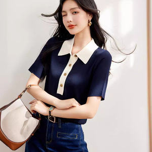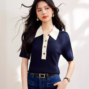 R3303 フレンチスタイル通勤万能ポロ襟五分袖ニットセーター レディース 夏 シンプル万能シャツ
