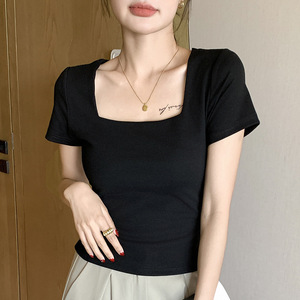 H292方襟プラス肩半袖tシャツ女春夏新作純欲ギャル修身白インナー肩トップス