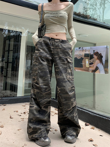 アメリカのゆったりとした広脚がカジュアルなジーンズ春夏の新型レトロな迷彩のストレートなひもの工装ズボンの女性