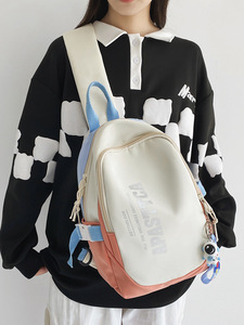 大学生の胸に男性のファッションブランドを包んで、スポーツ旅行に出かけます。
