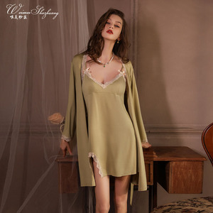 唯美紗新作ホームパジャマセット深vサスペンダー寝スカート女性レースサイドスリット高級感露背寝スカート