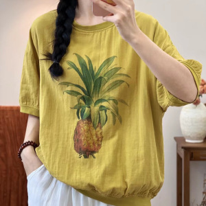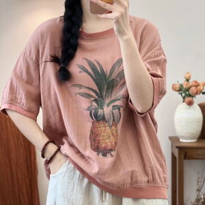 二重綿糸夏の新型レトロなプリントのゆるい丸首二重綿糸が痩せている半袖tシャツの上着の女性