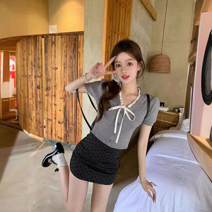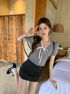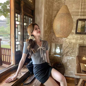 甘いスタイルのレースアップ薄手半袖アイスシルクニットセーターTシャツレディース新デザイントップカーディガンジャケット