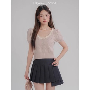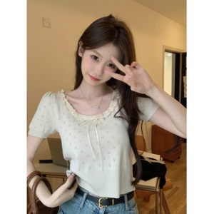 高腰蕾丝短袖镂空蝴蝶结T恤女装春季甜美修身打底衫内搭短款上衣
